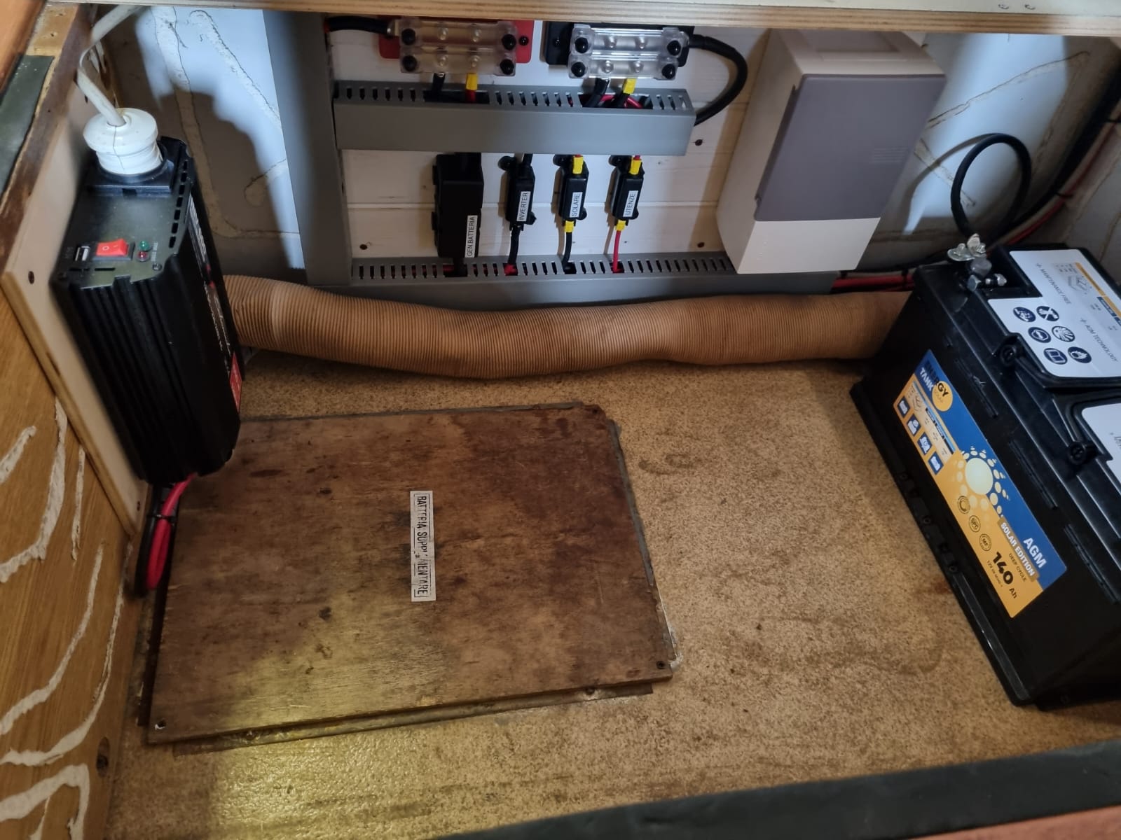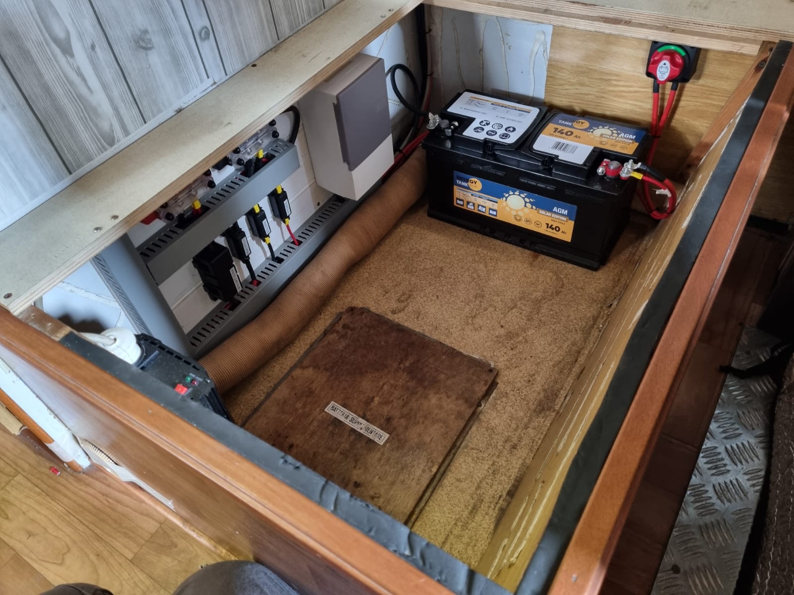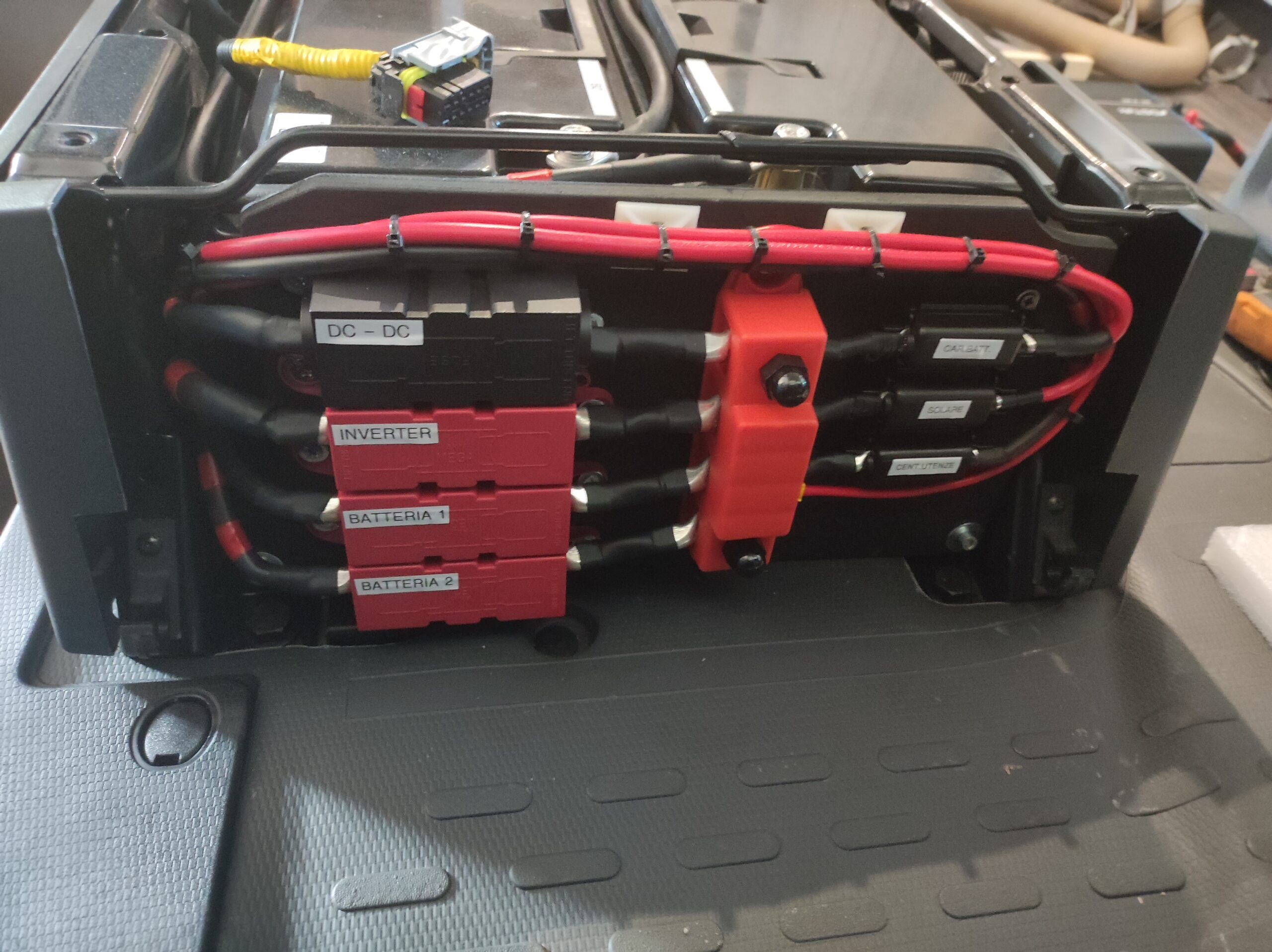 L’impianto originale era costituito da una batteria da 100Ah più fusibili di protezione: uno fungeva da protezione del caricabatterie da 220V, l’altro serviva da protezione del distributore utenze del DC-DC Charger.