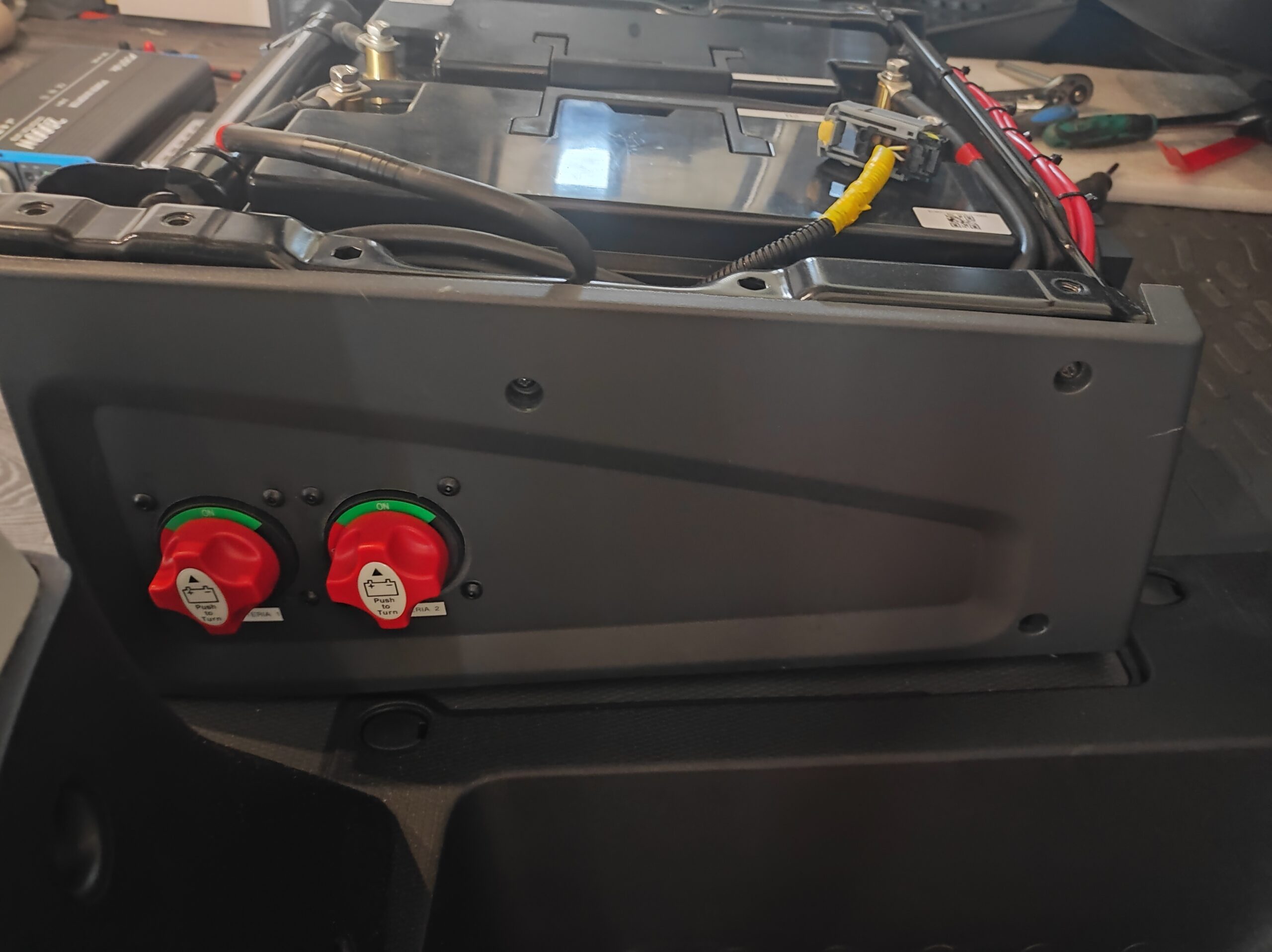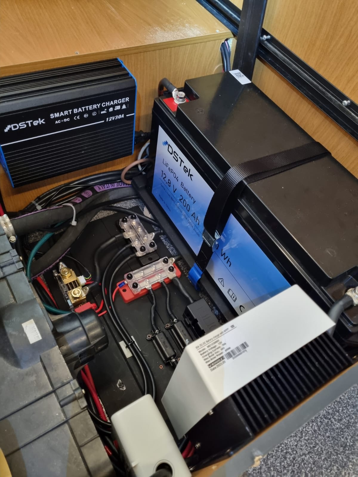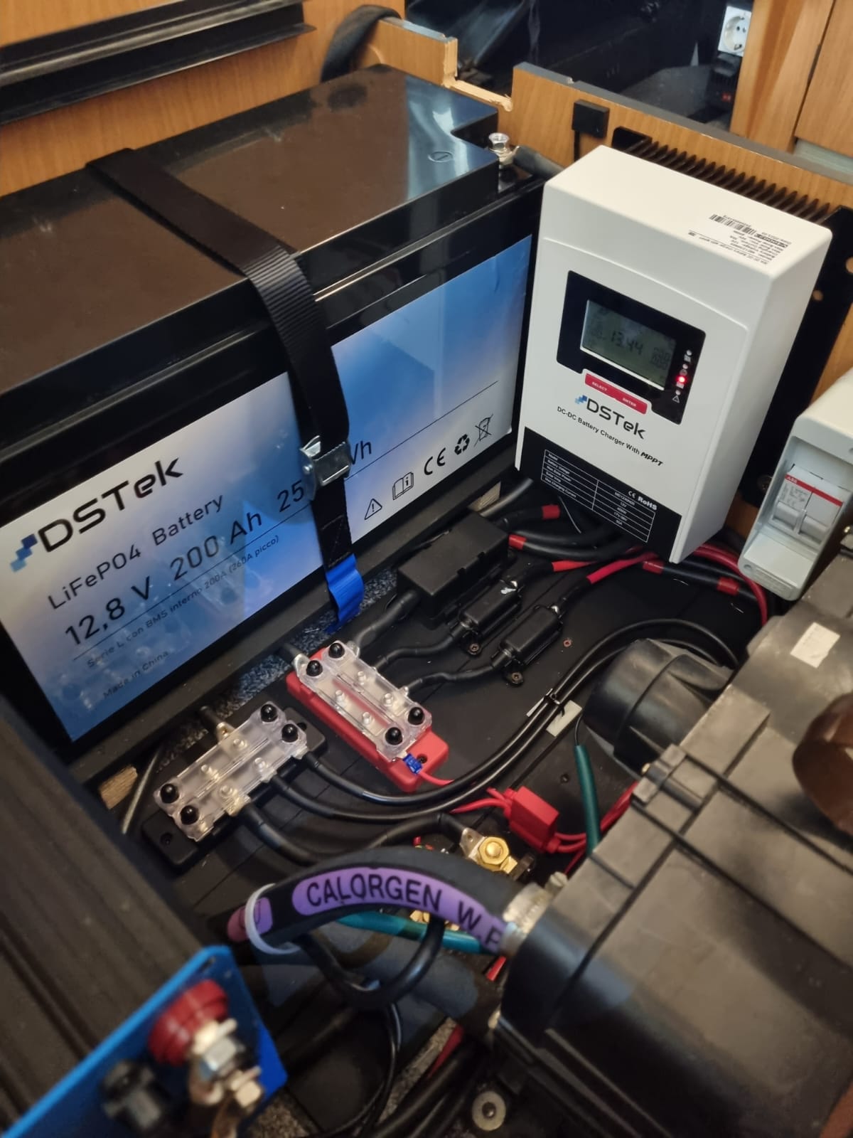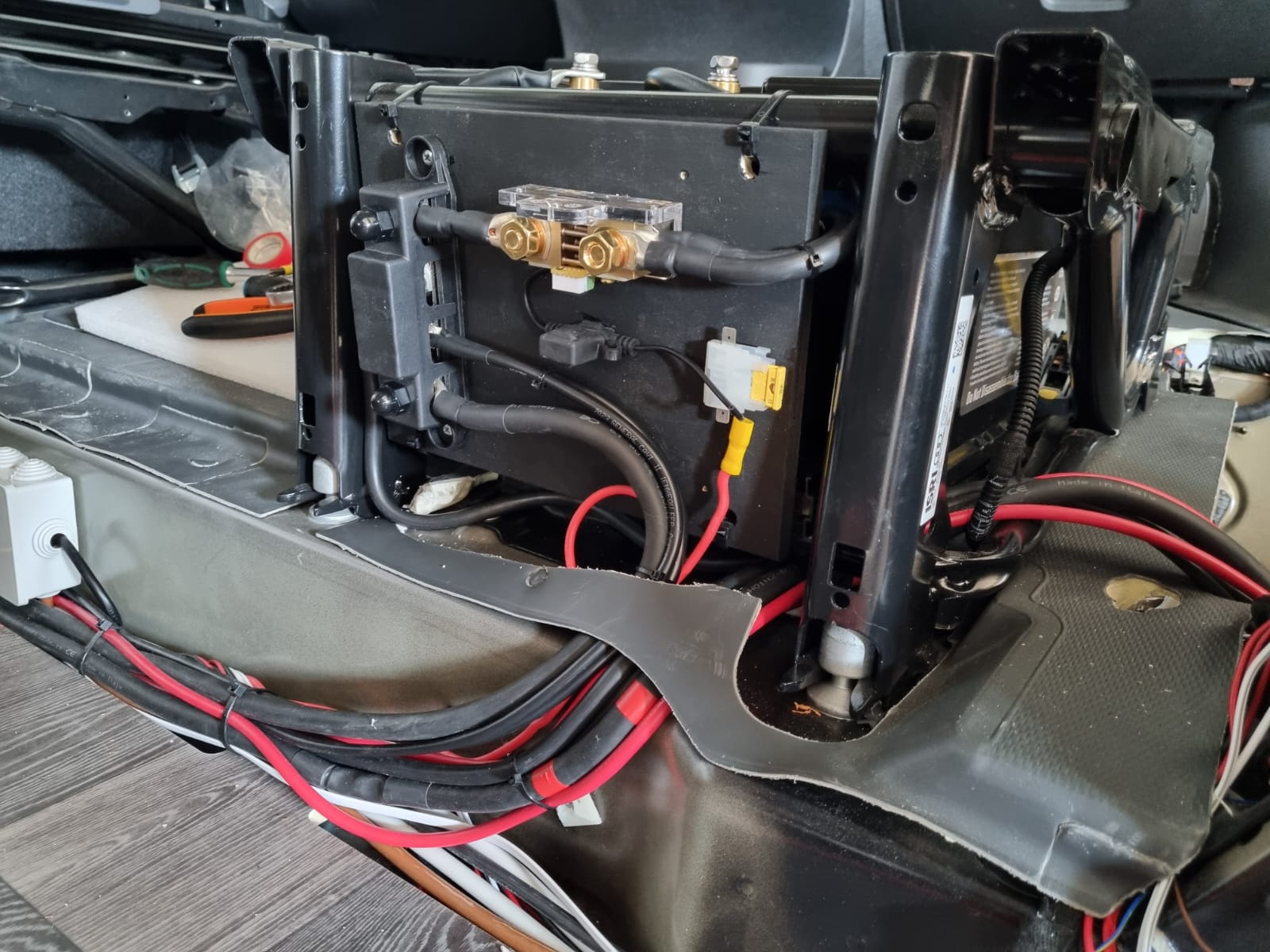 L’impianto originale era costituito da una batteria da 100Ah più fusibili di protezione: uno fungeva da protezione del caricabatterie da 220V, l’altro serviva da protezione del distributore utenze del DC-DC Charger.